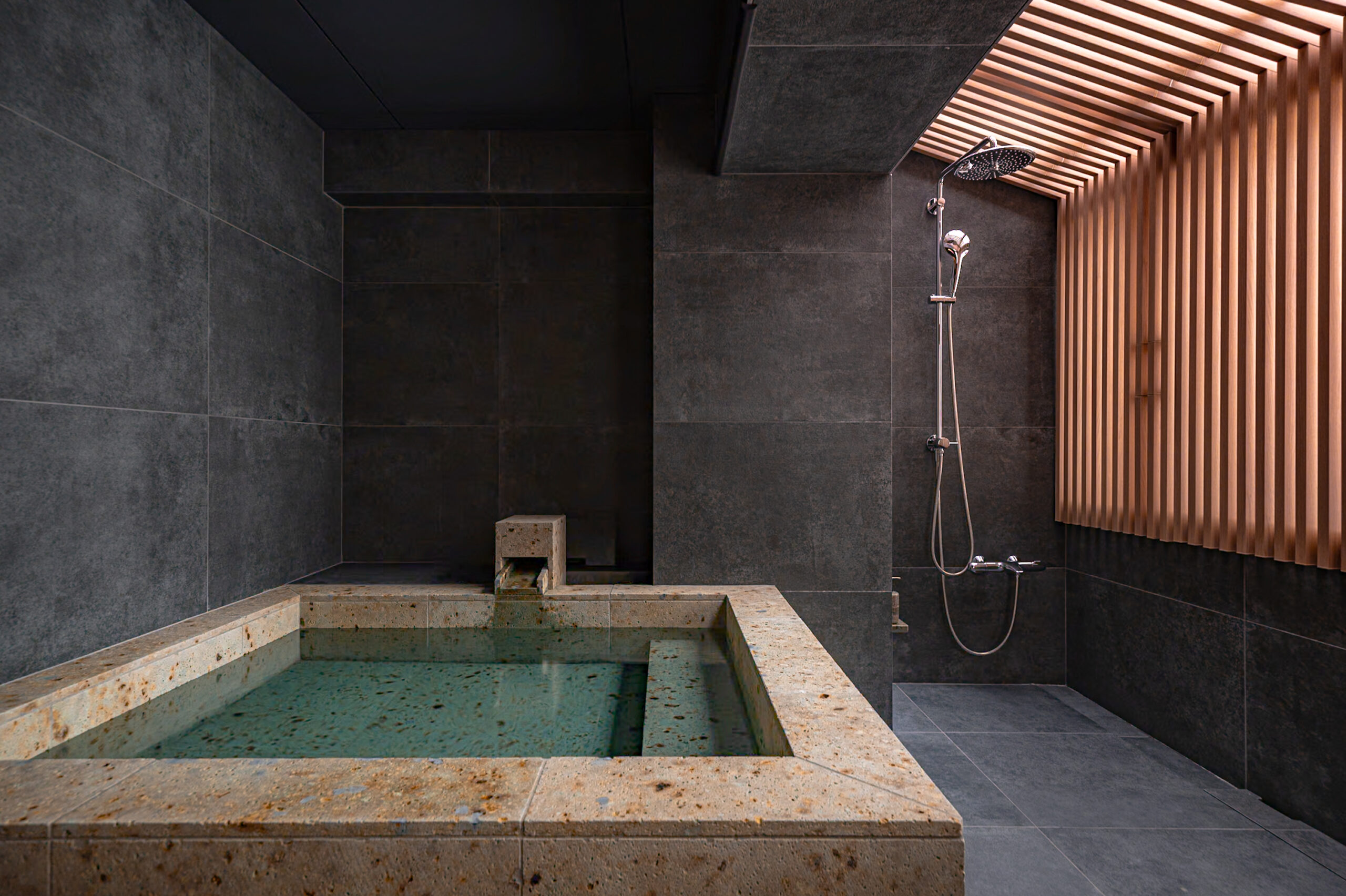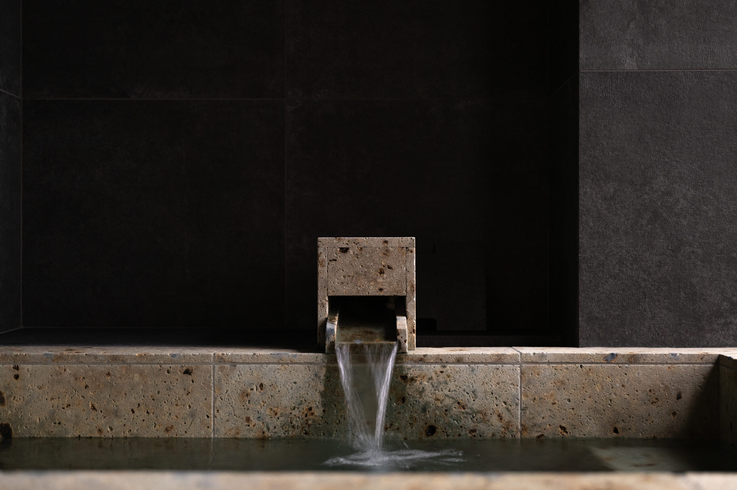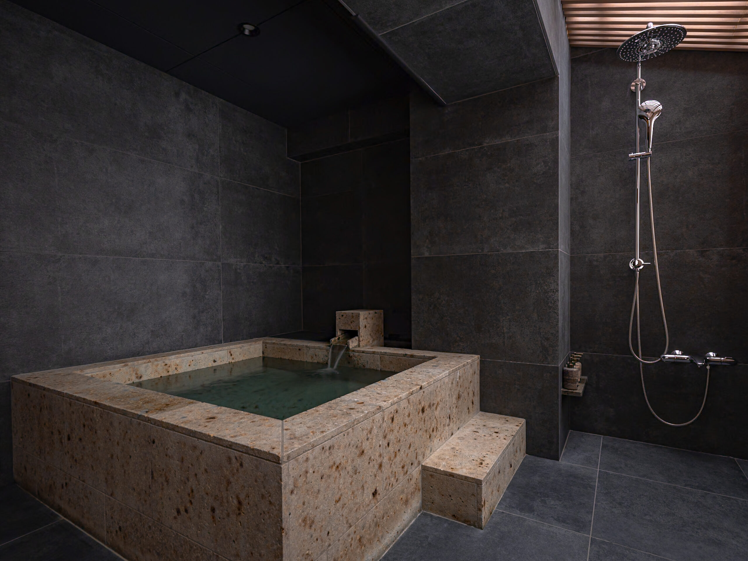 それは大谷石を贅沢に切り出した石風呂。湯を張ると、水面は翠色に輝き、